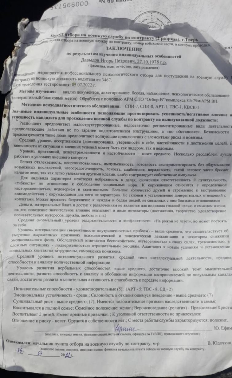 Цей висновок військового психолога має дату проведення тестування – 5 липня 2022 року. 6 липня з цим висновком ознайомлений начальник пункту відбору на контрактну службу майор Юдочкин.