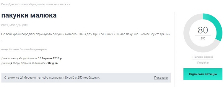 На едином сайте местных петиций продолжается сбор подписей под петицией «Пакунки малюка» в разделе «Семья. Молодежь. Дети».
