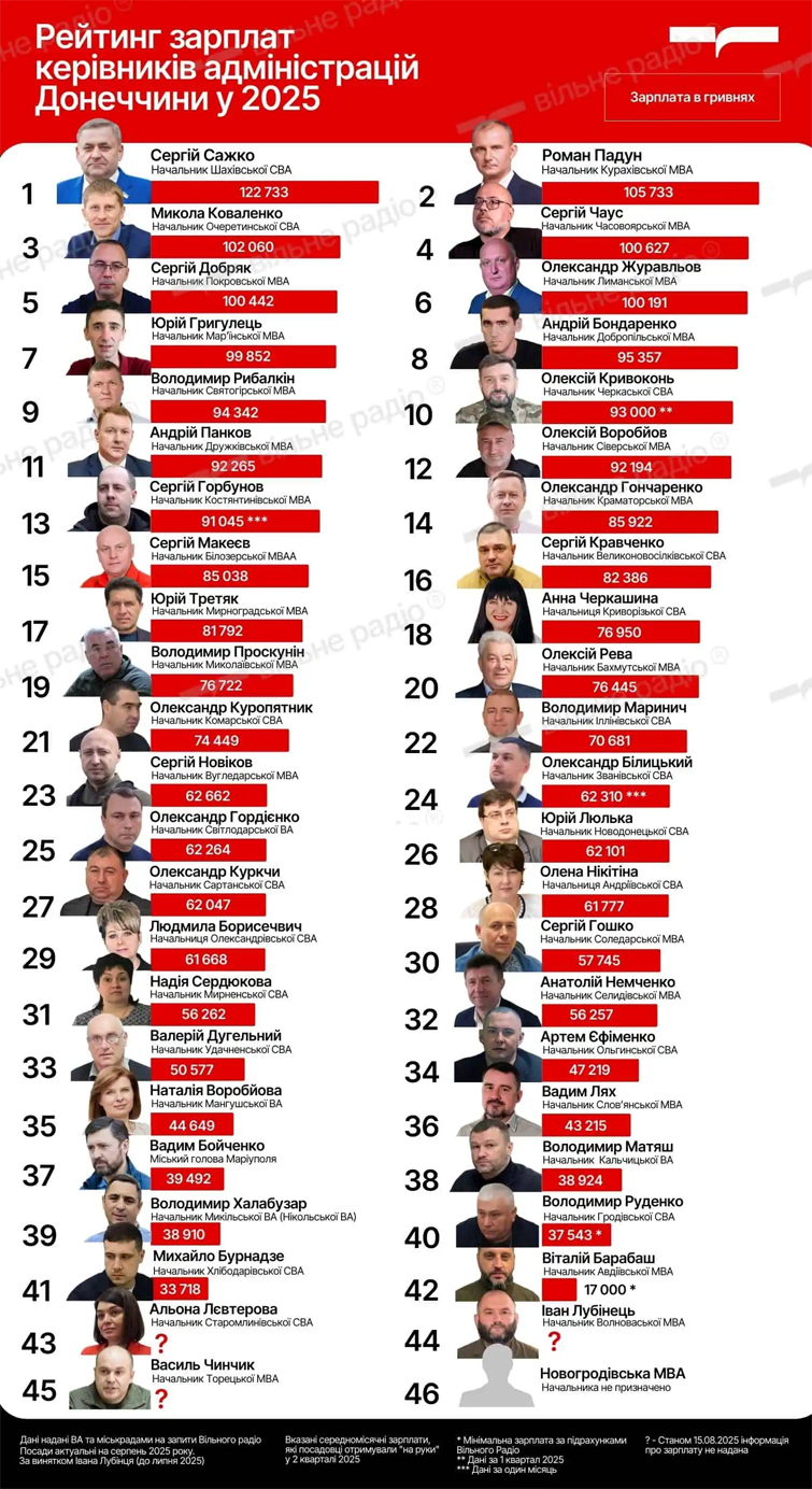 Скільки заробляють керівники громад на Донеччині під час війни? Журналісти Вільного Радіо проаналізували зарплатні відомості начальників військових адміністрацій регіону за другий квартал 2025 року. Виявилося, що дехто отримує понад 120 тисяч гривень щомісяця, а інші — у кілька разів менше. Найменшу зарплату серед очільників великих міст має начальник Слов’янської МВА Вадим Лях — 43 215 грн на місяць.