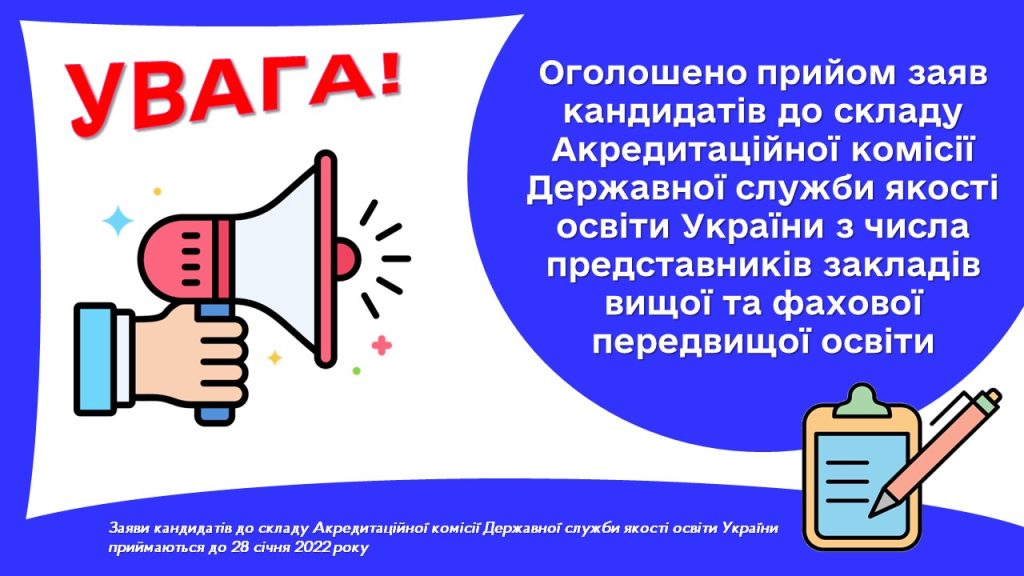 Заяви кандидатів до складу Акредитаційної комісії Державної служби якості освіти України приймаються до 28 січня 2022 року.
