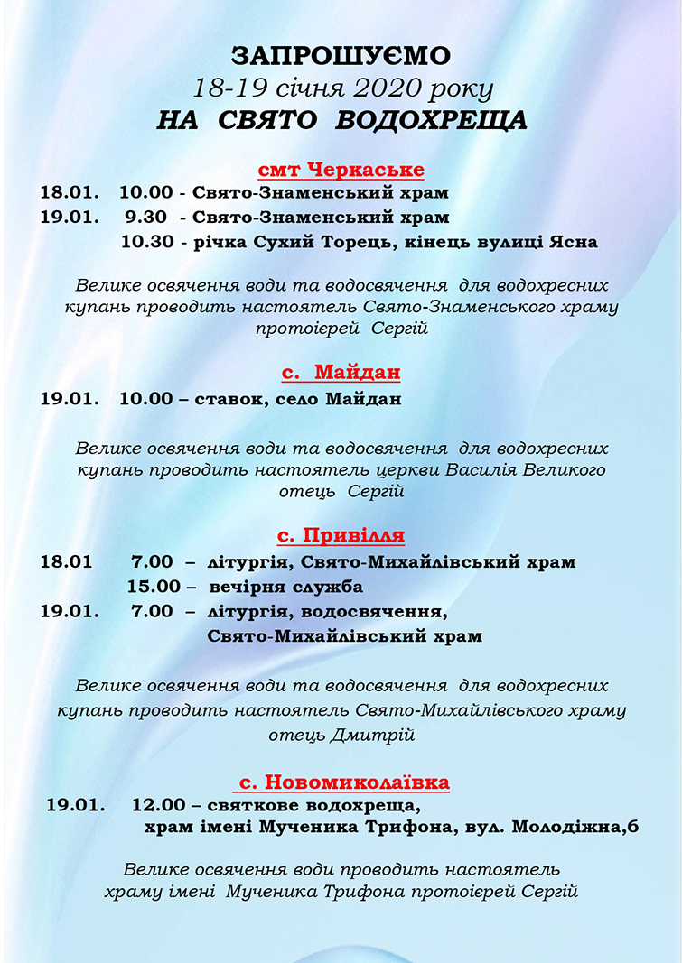 На сайте Черкасского поселкового совета появилась информация с графиком освящения воды и крещенских купаний в Черкасской громаде.