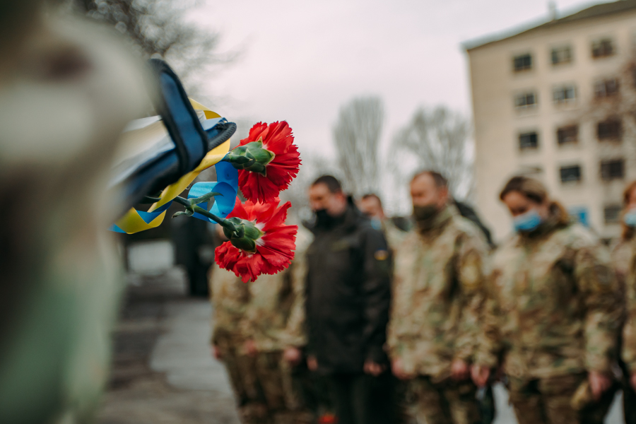 Власне, сам ритуал відбувся біля Стели пам’яті на території військового містечка військової частини 3035. Військовий капелан отець Діонісій, провів панахиду за загиблими воїнами.