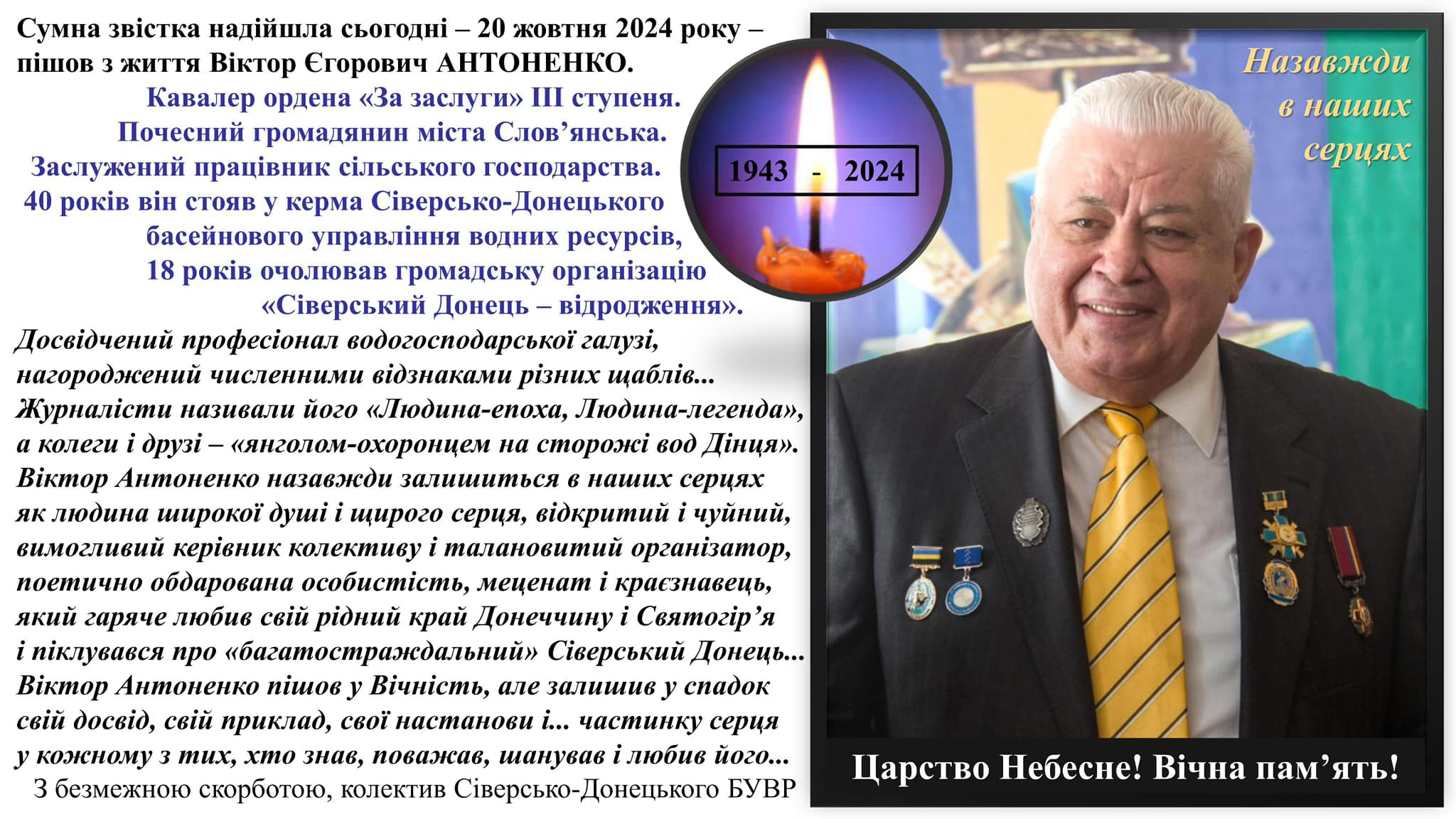 Сумна звістка надійшла сьогодні – 20 жовтня 2024 року – пішов з життя Віктор Єгорович АНТОНЕНКО…