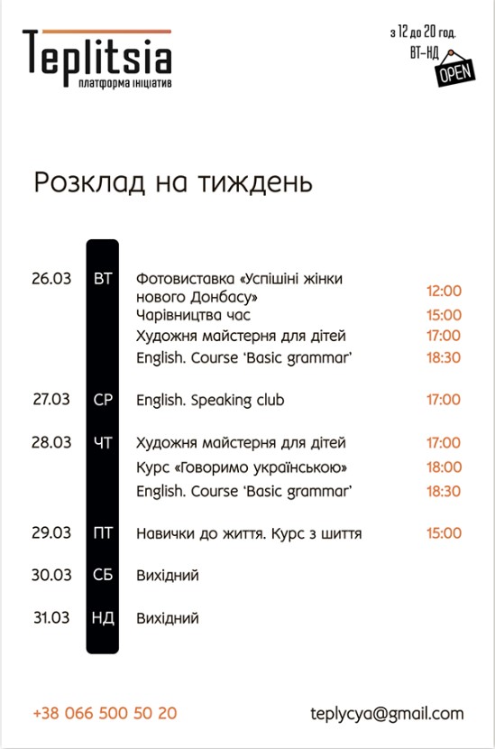 Платформа Ініціатив “Теплиця” на своїй сторінці в Фейсбук оприлюднила Розклад на тиждень з 26.03 по 31.03.