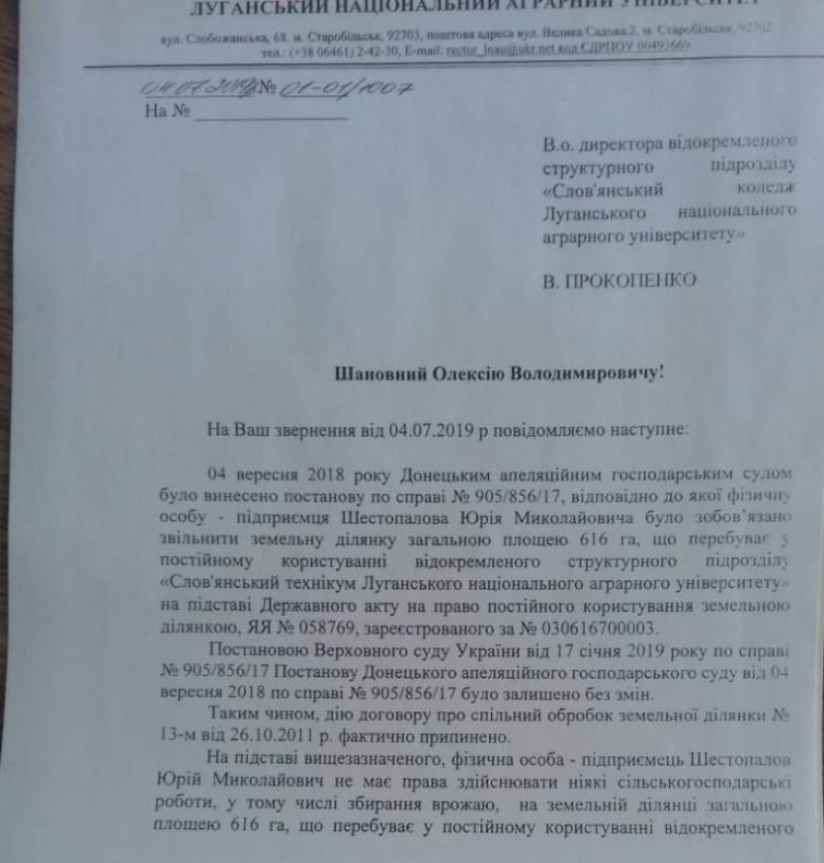 В письме от Луганского национального аграрного университета на имя и.о. директора Славянского аграрного колледжа сказано: