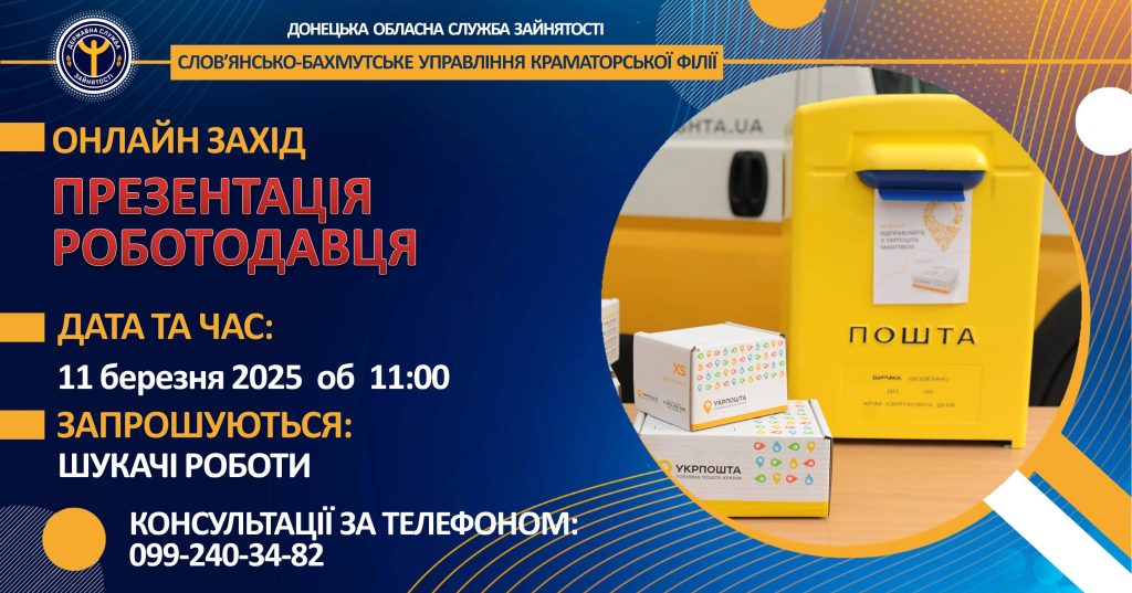 Фахівці Слов’янсько-Бахмутського управління Краматорської філії Донецького обласного центру зайнятості запрошують шукачів роботи на онлайн захід – презентацію роботодавця 11 березня 2025 року об 11:00. Свої вакансії презентує Акціонерне товариство “Укрпошта” за посадами “начальник відділення поштового зв’язку” та “провідний інженер-енергетик”.