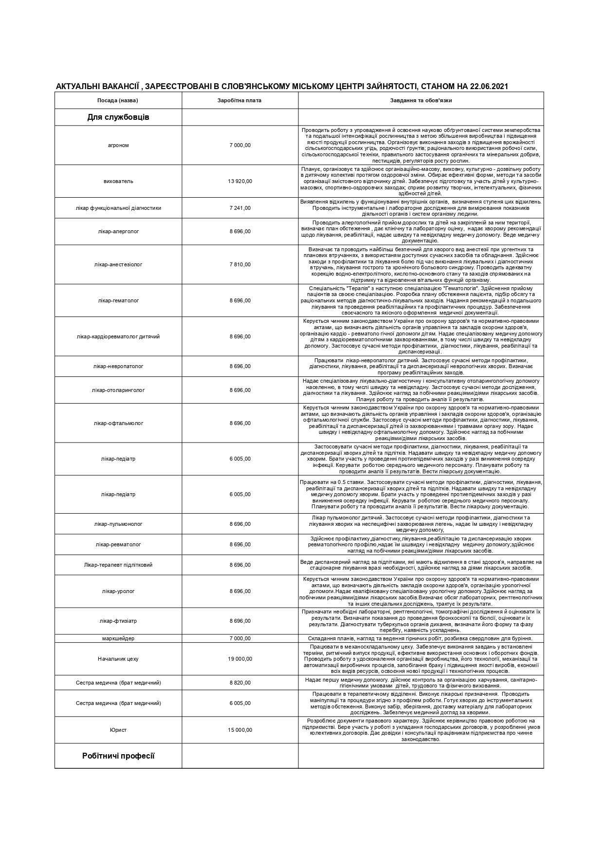 Актуальні вакансії, зареєстровані в Слов’янському міському центрі зайнятості, станом на 22.06.2021