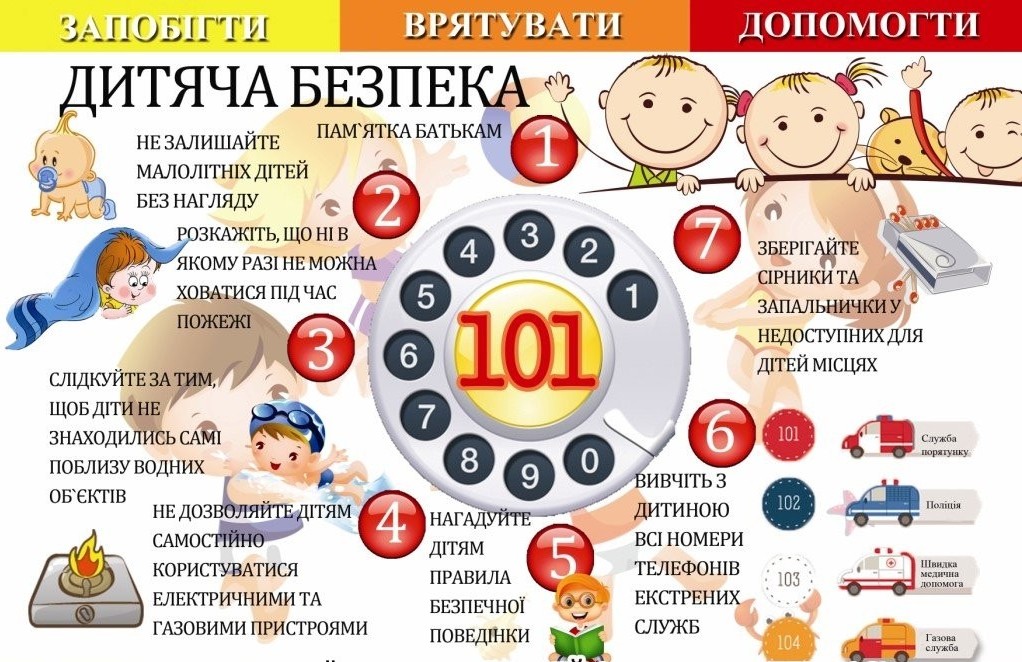 – обов’язково розкажіть дітям, що у разі виникнення пожежі необхідно терміново сповістити про це дорослих та Службу порятунку за номером “101”;