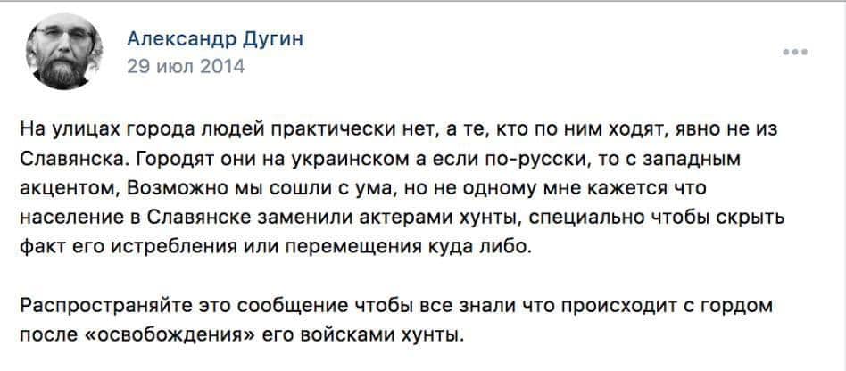 Це знімок з екрана зі сторінки Дугіна у соціальній мережі, де він несе маячню, щодо нещодавно звільненого Слов’янська. Допис датовано 29 липня 2014 року. Висновки всі можуть зробити самі, наскільки ця людина перебувала у якісь своєї реальності.