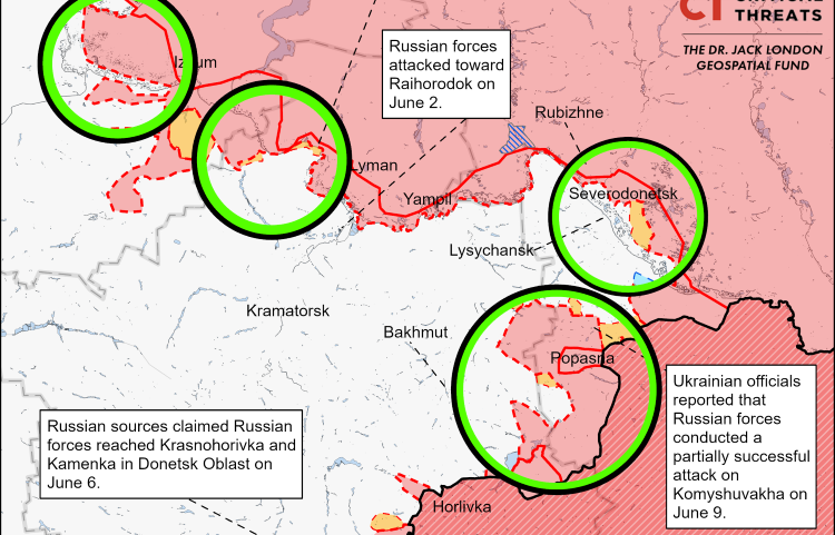 «Геолокаційні кадри показали, що російські війська 11 червня увійшли на північну околицю Богородичного (приблизно за 25 км на південний схід від Ізюма). Раніше ISW оцінювало, що російські війська можуть спробувати відрізати українські GLOC у Сіверську та провести оточення замість просування на Слов’янськ».