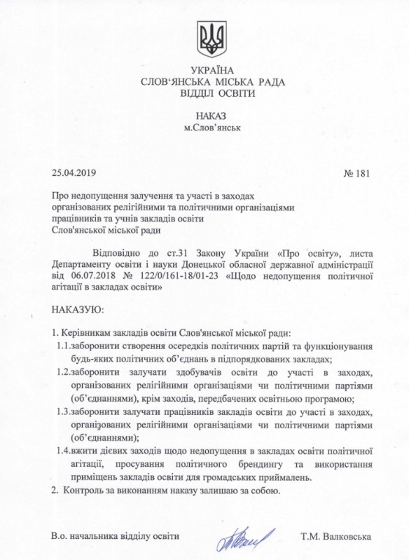 В Славянске Донецкой области городской отдел образования опубликовал приказ о недопущении вовлечения и участия в мероприятиях, организованных религиозными и политическими организациями, работников и учащихся учреждений образования.