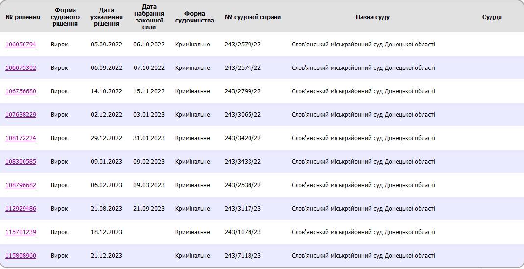 За даними Єдиного держреєстру судових рішень Слов’янській міськрайонний суд ухвалив 5 вироків у 2022 році щодо інформаторів ворога.