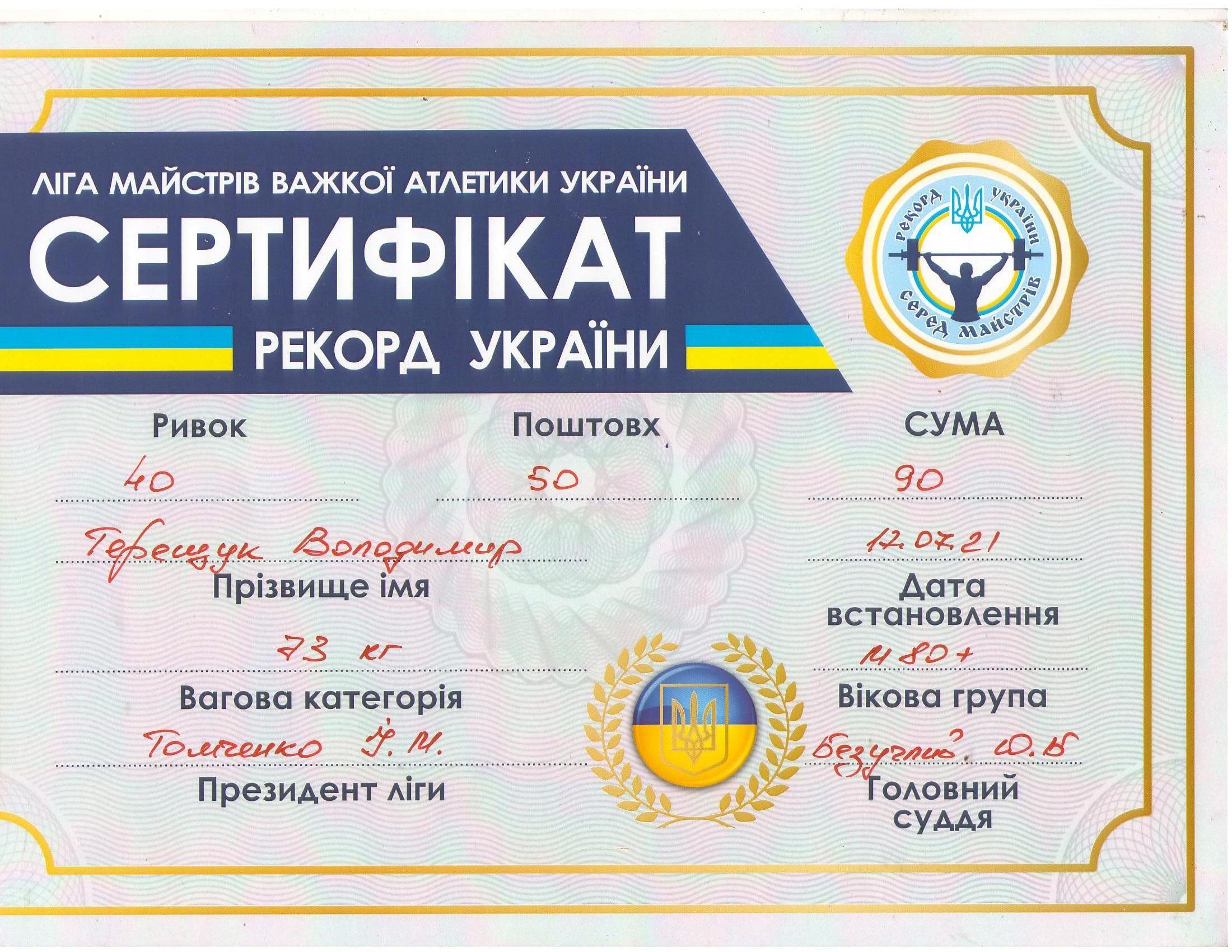 Следует также отметить, что Владимир Теренович установил рекорд Украины среди мастеров, осуществив толчок и рывок штанги суммарно 90 кг в возрастной группе 80+.
