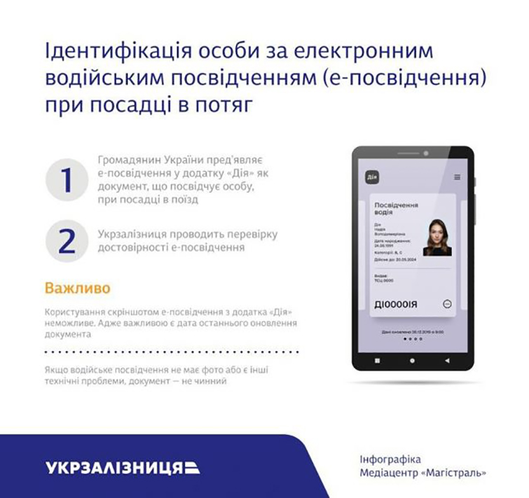 «В случае, если у е-удостоверения не будет фото или будут возникать технические проблемы, оно не будет считаться действительным. Пассажиру необходимо будет предъявить обычный документ, удостоверяющий личность. Кроме того, нельзя использовать скриншот удостоверение из приложения “Дія”», – говорится в сообщении.