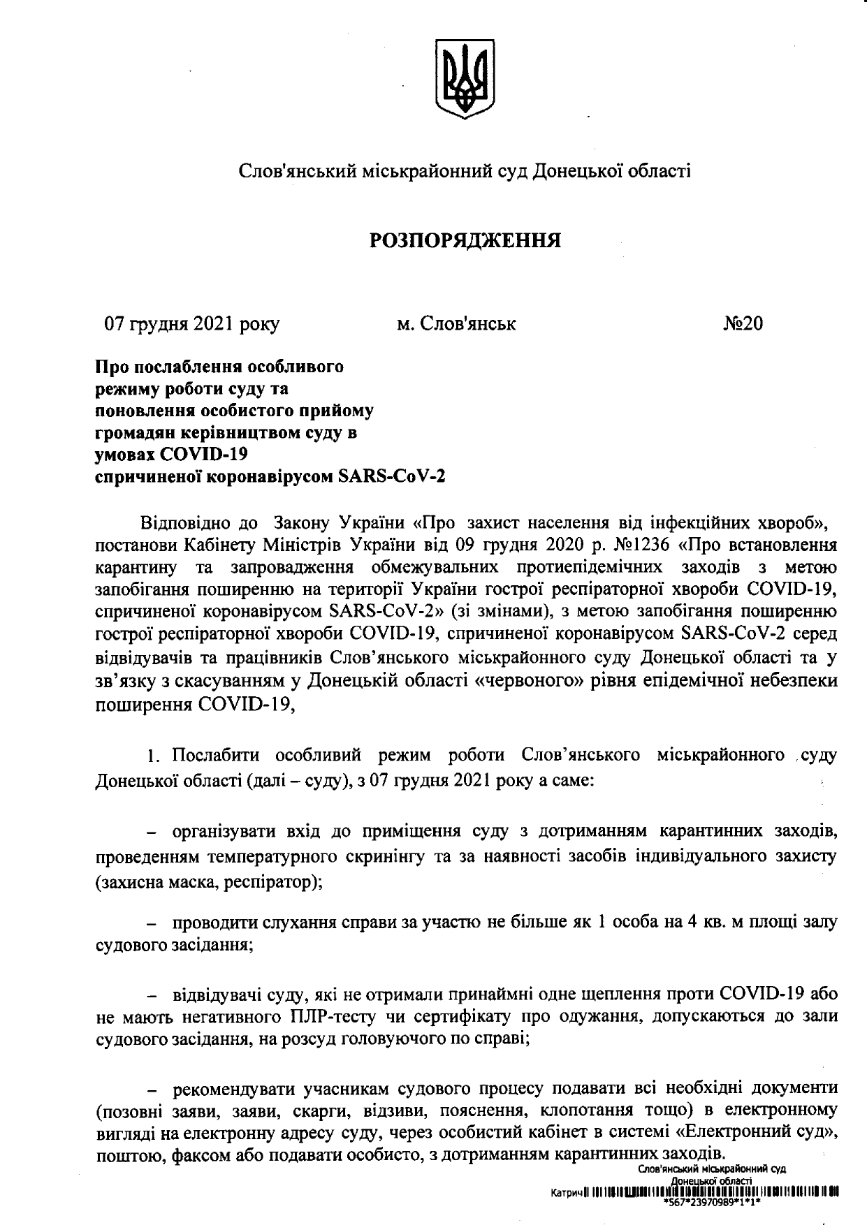 Слов’янський міськрайонний суд повідомив про послаблення особливого режиму роботи суду та поновлення особистого прийому громадян керівництвом суду