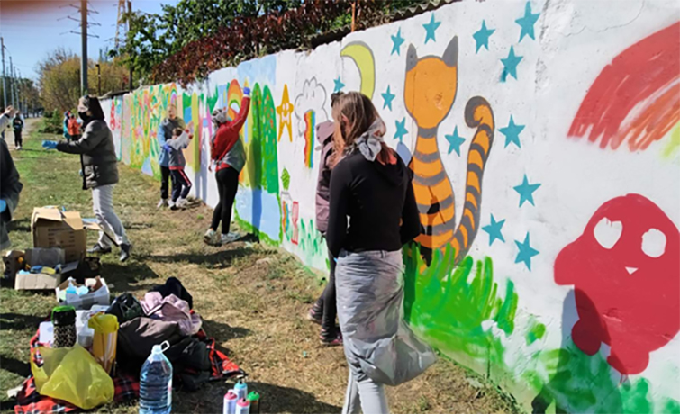 «Все почалося ще у 2021 році, коли ми розмальовували стіну поряд зі Слов’янським бульваром. Ми тоді вирішили зробити яскравий малюнок і назвали цей проєкт «Розмалюємо світ разом». Цей проєкт підтримувала програма розвитку ООН «Відновлення та розбудова миру». Тоді прийшло багато людей, при цьому не тільки маленькі діти, а й вже дорослі. І це стало стартом».