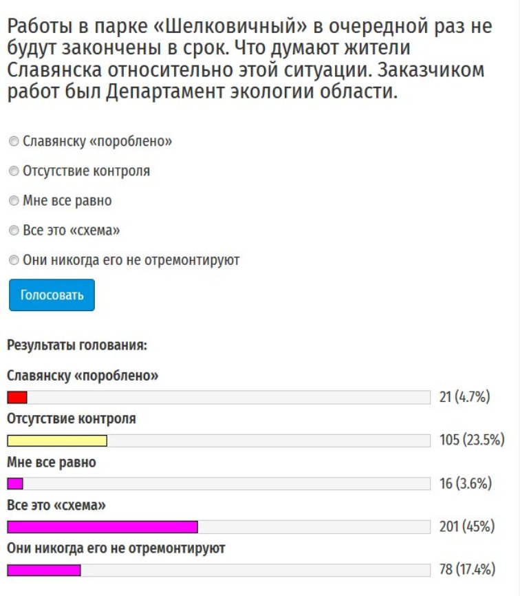 Коли стало зрозуміло, що в черговий раз парк Шелковичний не буде отремонтований у строк, ми провели опитування читачів нашого сайту, що вони думають стосовно ситуації, яка склалася навколо цього об’єкту. Замовником робіт у парку є Департамент екології ДонОДА. Проект, який кілька разів корегувався, робило комунальне підприємство Слов’янська СлавУКС. Треба нагадати, що роботи у парку почалися у листопаді 2017 р. Черговий раз завершити реконструкцію парка повинні були у червні цього року, а тапер дату завершення робіт перенесли на жовтень.