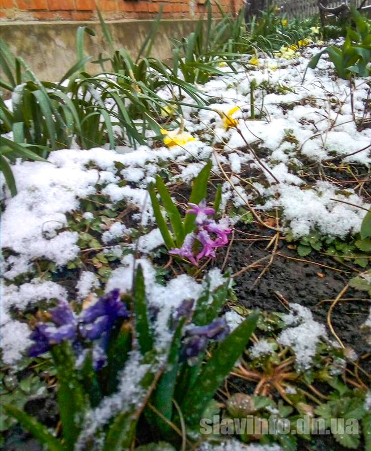 Фотографии заснеженных цветов выложил в Фейсбук в группе «Славянск в фотографиях» Сергей Белоусов. « 23 марта», – подписал фото автор.