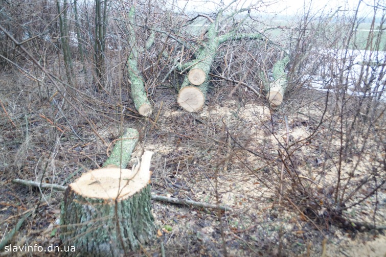 Далі поїхали дивитися на місця «роботи» чорних лісорубів. Самі великі дерева випиляні у лісосмузі на відстань 500 метрів. Деякі знищені дерева ще не попиляні, і кинуті а ще браконьєри залишили після себе пеньки дубів, які росли декілька десятиліть.