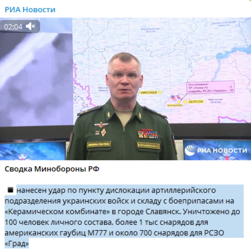 Один з таких фейків, де фігурує Слов’янськ був запущений на брифінгу МО РФ. Там брехали, про те, що було завдано удару по «Керамкомбінату» і там було знищено понад 1000 снарядів для американських гаубиць М 777 та приблизно 700 снарядів для РСЗВ «Град».
