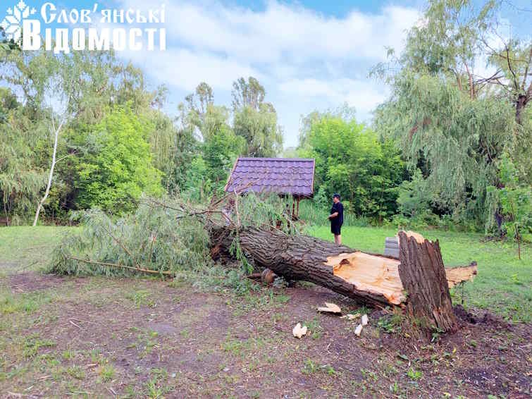 Сильні вітри, що пронеслися Слов’янськом цими днями, спричинили падіння аварійного дерева в улюбленому містянами Шовковичному парку. Старенька, вже трухлява верба зламалася та впала прямо біля альтанки, де зазвичай відпочивають відвідувачі парку.