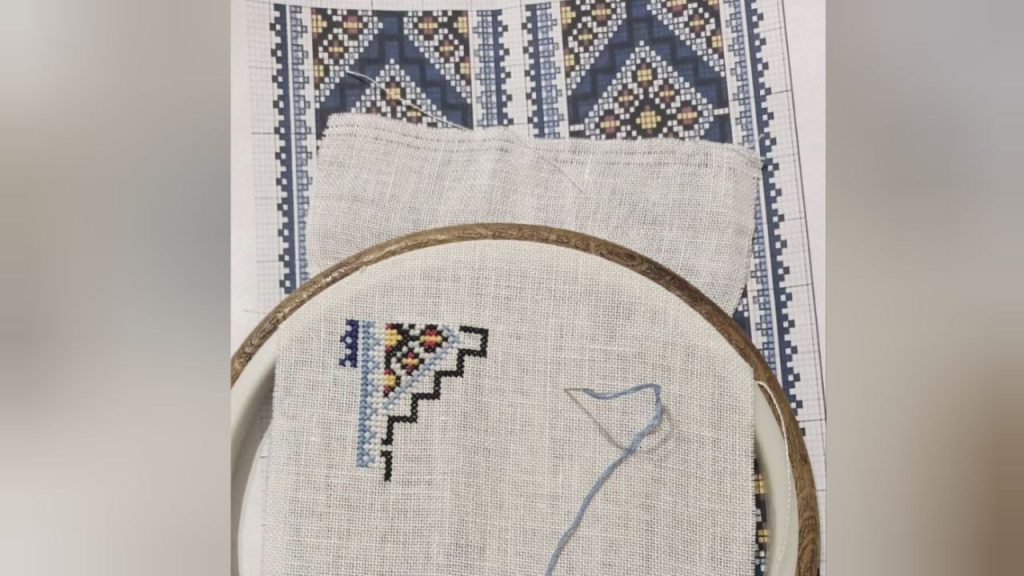 Частину вишивки вже завершено. Процес потребує значної уваги до деталей, адже кожен елемент створюється вручну та вимагає точності виконання.