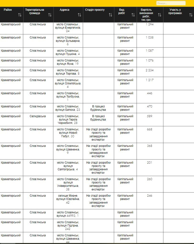 В таблиці можна побачити в реальному часі, де саме планують ремонт сховища або нове будівництво, вартість робіт та джерело фінансування. Також наголошується, що всі роботи мають бути виконані до кінця 2023 року.