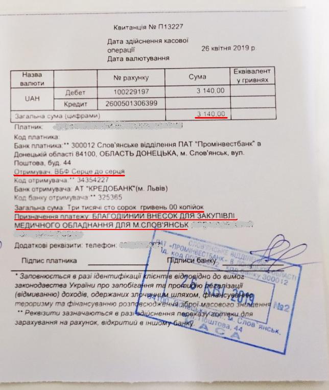 Всі кошти, що були зібрані, перераховано на рахунок ВБФ «Серце до серця» (рр 2600501306399 в ПАТ «Кредобанк», МФО 325365, код ЄДРПОУ 34354227. Найменування платежу: «Благодійний внесок для закупівлі медичного обладнання для м. Слов’янська, Донецької області»)