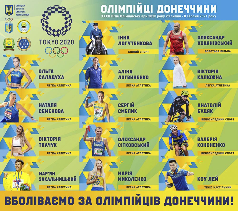 З 23 липня по 8 серпня місто Токіо (Японія) прийме XXXII Літні Олімпійські ігри, які мали відбутися влітку 2020-го, але були перенесені на рік через пандемію COVID-19. У складі олімпійської збірної України на змаганнях у 25 видах спорту виступлять 157 атлетів, серед яких Донецьку область представлять 14 осіб: 9 – легка атлетика, 2 – велосипедний спорт, по 1 – боротьба вільна, кінний спорт, теніс настільний.