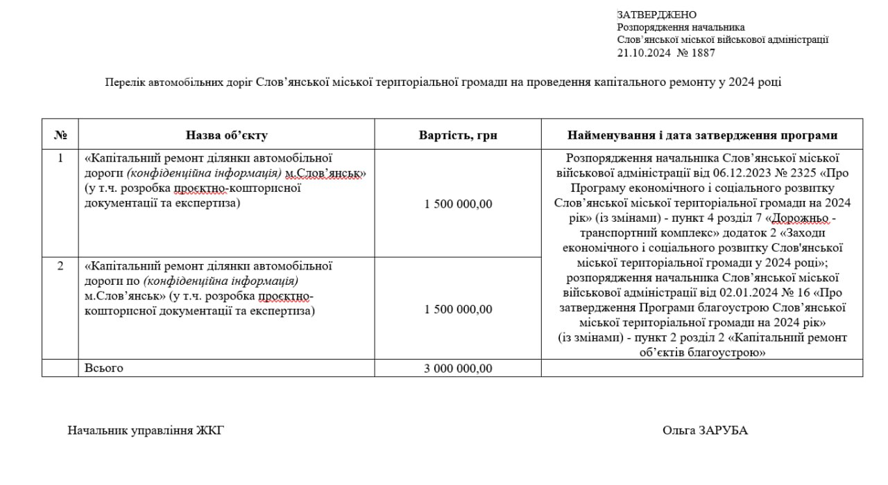 Слов’янська МВА виділяє з місцевого бюджету 3 млн грн на капітальний ремонт доріг у громаді до кінця 2024 року. Однак інформація про те, де саме будуть проводитись роботи, позначена як «конфіденційна».