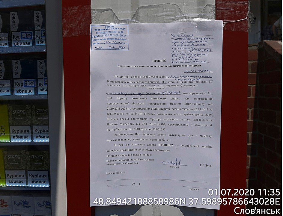 На території Слов’янської міської ради по вул.Центральна (біля буд.38) 01.07.2020р. виявлено самовільно встановлену тимчасову споруду (кіоск “УКРТАБАК”) для здійснення підприємницької діяльності (власник не відомий), чим порушено п.5 Розділу VІІІ Типових правил благоустрою території населеного пункту, затвердженим Наказом Мінрегіонбуду від 27.11.2017 №310 та зареєстрованим в Міністерстві юстиції України 18.12.2017 за №1529/31397.
