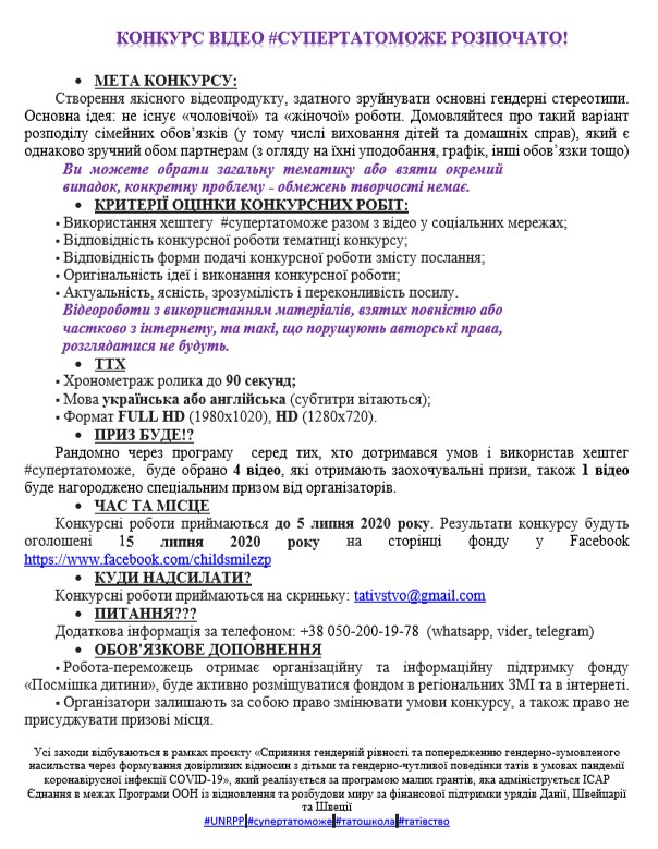 В рамках проекту «Сприяння гендерній рівності та попередженню гендерно-зумовленого насильства через формування довірливих відносин з дітьми та гендерно-чутливої поведінки татів в умовах пандемії коронавірусної інфекції COVID-19», проходить конкурс відео «Супертатоможе», який передбачає створення якісного відеопродукту, здатного зруйнувати основні гендерні стереотипи. Основна ідея: не існує «чоловічої» та «жіночої» роботи.
