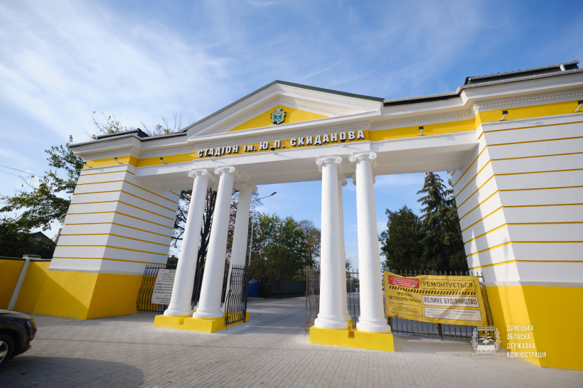 Така масштабна реконструкція стадіону ім. Юрія Скиданова комунального закладу «Спортивний клуб за місцем проживання «Культурно-спортивний центр» міста Слов’янськ була проведена вперше за 67 років. З метою історичної спадкоємності зберегли кольорову гамму, що була на момент відкриття споруди в 1953 році — поєднання жовтого й білого.
