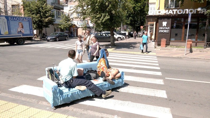 У Центральному парку Вінниці місцеві мешканці фотографували диван на колесах і підтримували їхню ініціативу.