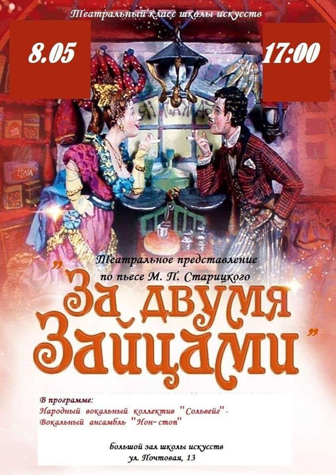 “8 травня школа мистецтв запрошує всіх поцінювачів театрального мистецтва на виставу “За двумя зайцами”.