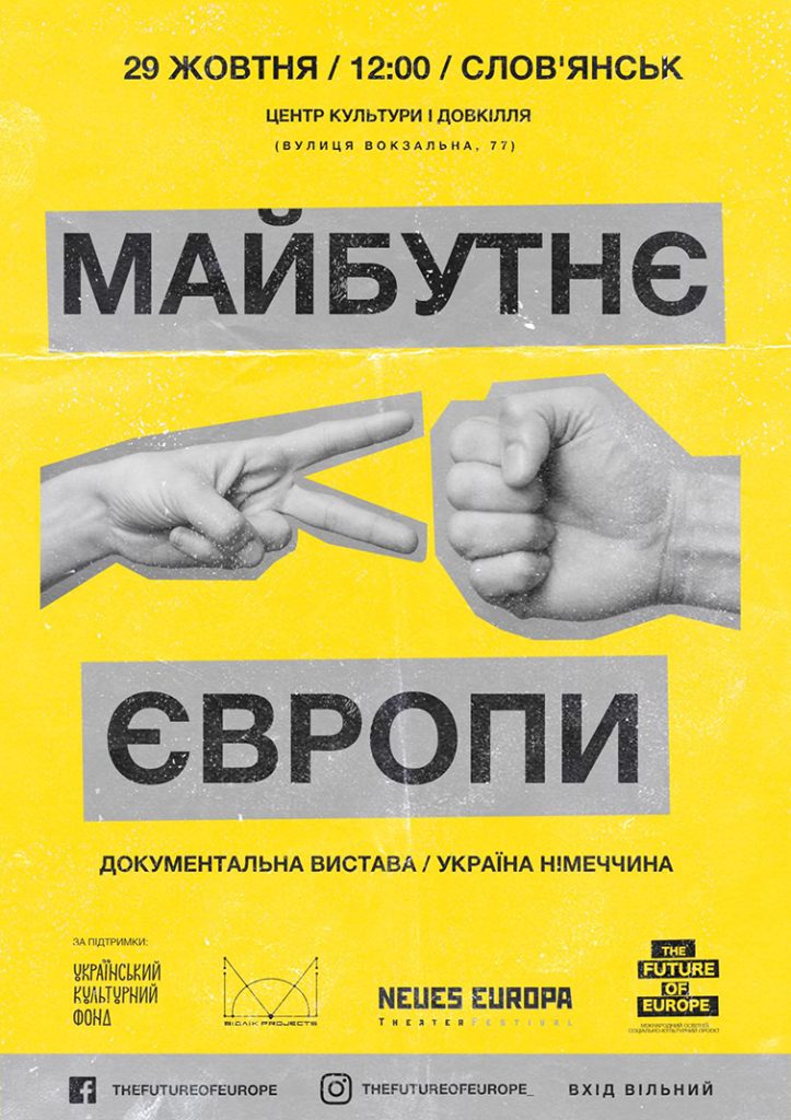 29 октября 2019 в 12.00 в Центре культуры и окружающей среды состоится документальное представление “Будущее Европы”, в основе которого жизнь 15-ти подростков, детство которых прошло на Донбассе.