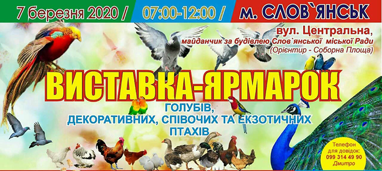 7 марта 2020 года в Славянске на площадке за Славянским городским советом с 7.00 до 12.00 сосотоится выставка-ярмарка голубей, декоративных, певчих и экзотических птиц.