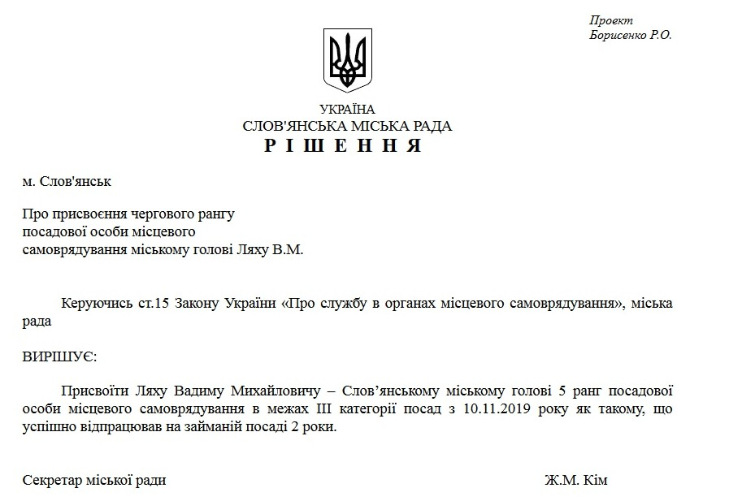 Міському голові Вадиму Ляху планують присвоїти черговий ранг, 5 ранг посадової особи місцевого самоврядування. Відповідний проект рішення оприлюднений на сайті «Нормативні акти Слов’янської міської ради».