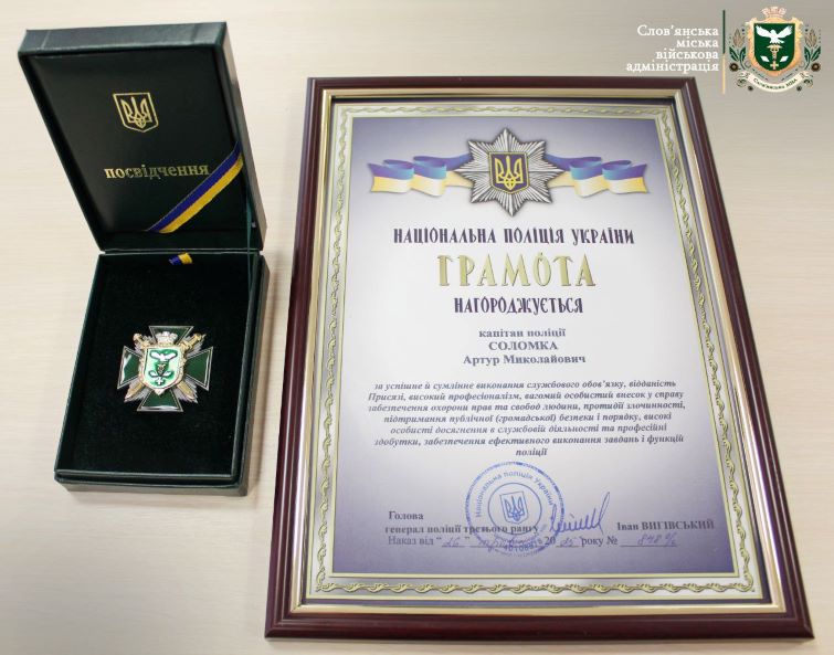 Відзнаку Словʼянської МВА «Знак пошани «Разом до перемоги» вручили офіцеру Словʼянської територіальної громади Артуру Соломці