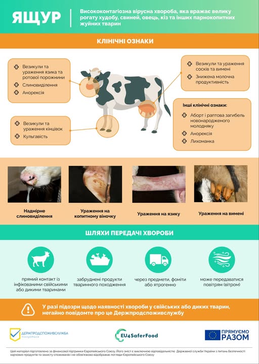 Ящур – небезпечне захворювання, яке вражає велику рогату худобу, свиней, овець, кіз тощо. Воно проявляється лихоманкою, утворенням пухирів у ротовій порожнині, на носі, кінцівках, вимені, а також загальним пригніченням стану тварин.