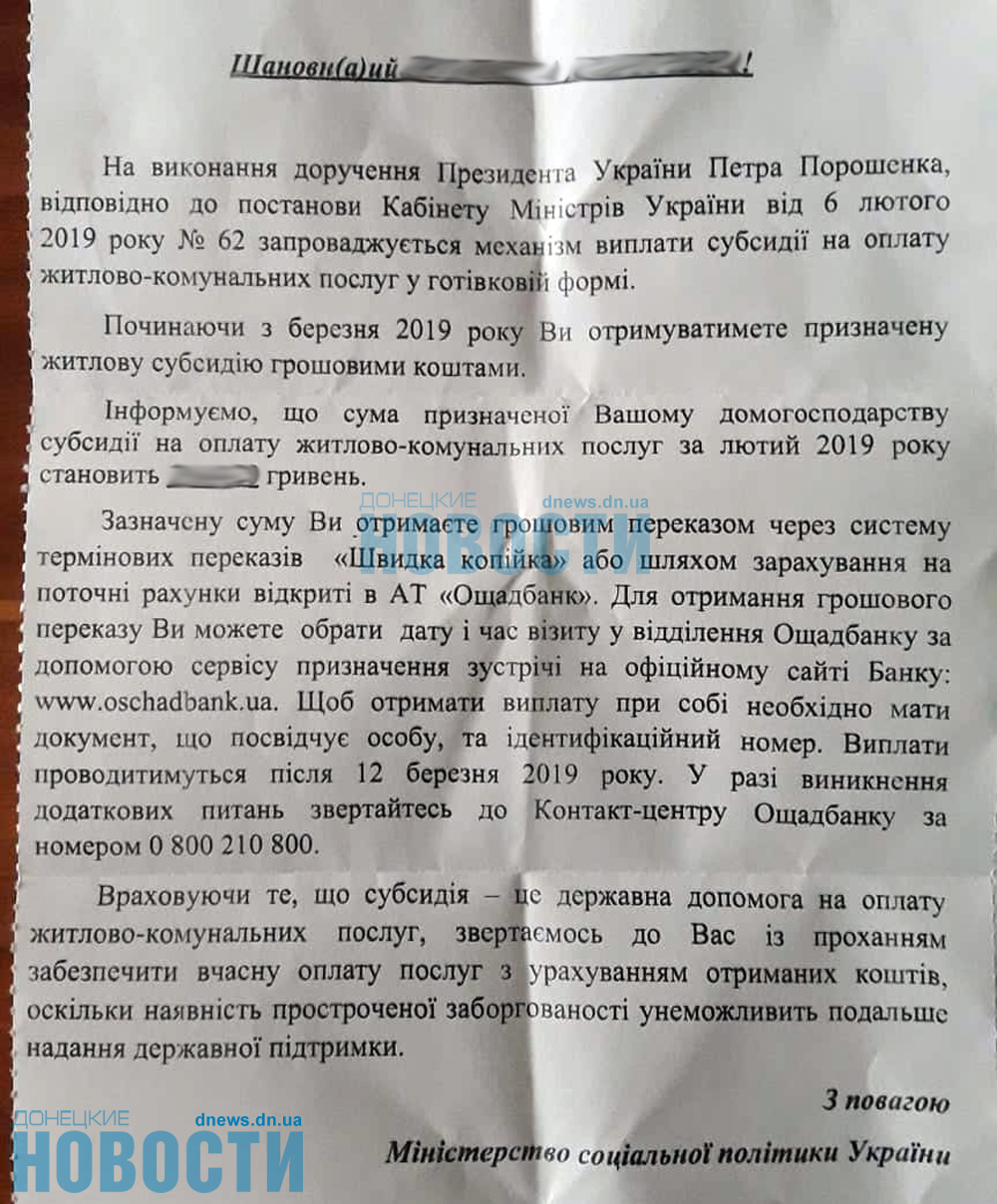 В листовках приводится информация о старте процесса монетизации субсидий, начиная с марта 2019 года. «Во исполнение поручения Президента Украины Петра Порошенко, согласно постановлению Кабинета министров Украины от 6 февраля 2019 № 62, вводится механизм выплаты субсидии на оплату жилищно-коммунальных услуг в наличной форме», – говорится в сообщении.