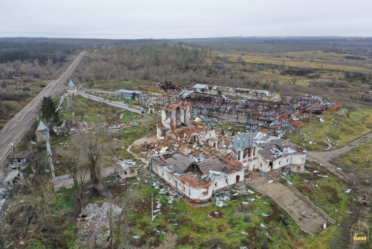 На сайті Святогірської лаври, де було викладено ці фото, немає жодної згадки про те, хто стоїть за цими руйнуваннями. Тобто Росія, війська якої знищили всі будівлі, взагалі не згадується.
