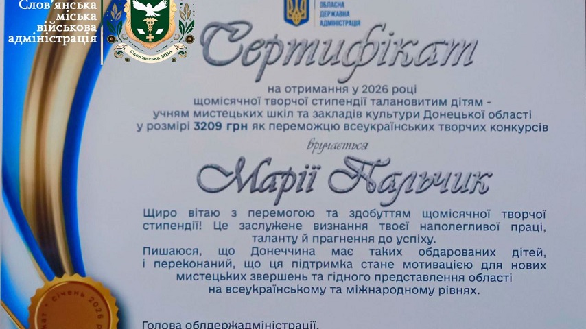 Обласну творчу стипендію призначено учениці 3 класу філії Школи мистецтв міста Слов’янська Марії Пальчик. Разом із нею цього року стипендіатами стали ще 13 обдарованих учнів мистецьких шкіл Донеччини.