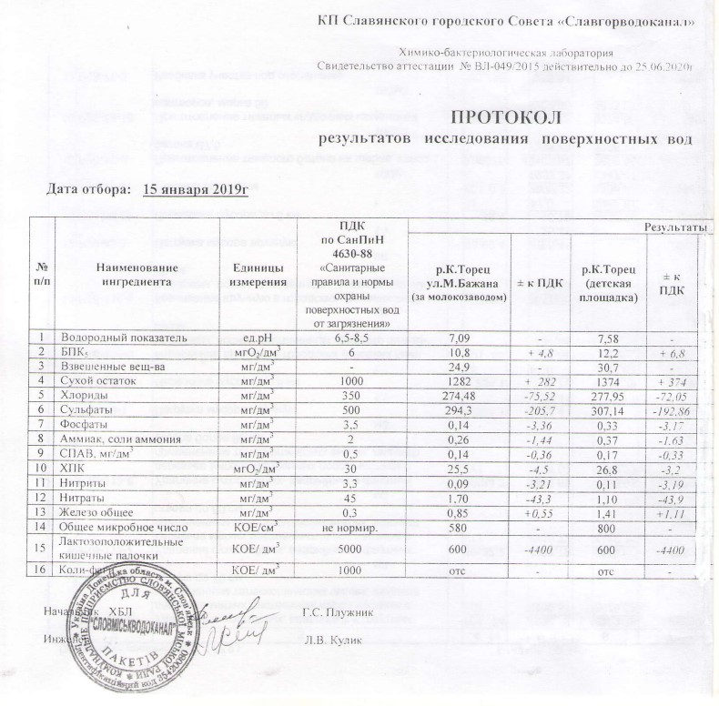 Представителями лабораторной службы в январе-феврале 2019 были отобраны пробы поверхностной воды. Результаты анализа: