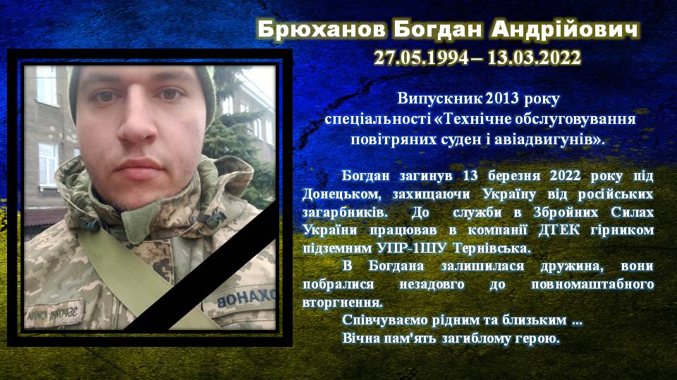 Брюханов Богдан, навчальна група 1М10. Випускник 2013 року спеціальності «Технічне обслуговування повітряних суден і авіадвигунів».