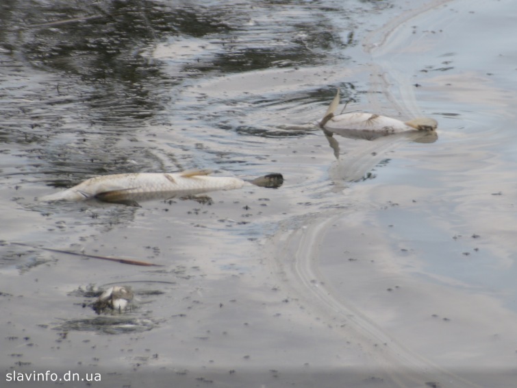 У воді плавають дві загиблі щуки досить великого розміру. Поруч плаває загибла, менша по розміру, риба. Ще дві щуки, які задихнулися або потравилися плавали з протилежного боку водойми. Під  берегом біля очерету на поверхні воді плавають декілька загиблих сонячних окунів.