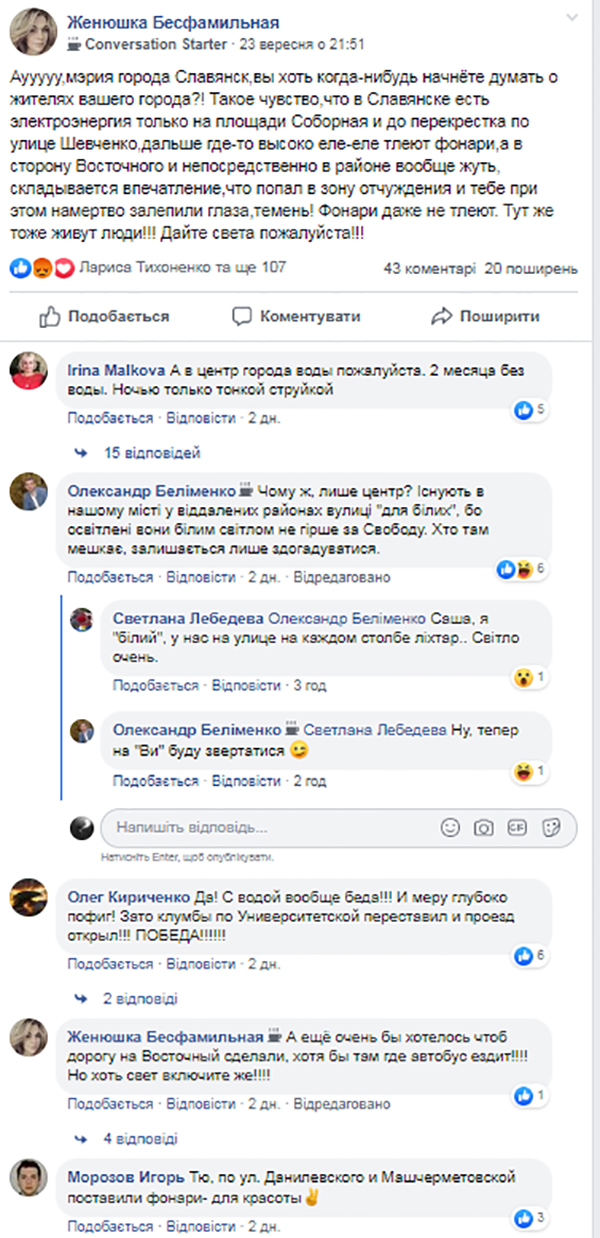 Жители города Славянска в социальной сети Фейсбук активно ругают местную власть за постоянное отсутствие освещения, воды и газа в городе, за неудоблетворительное состояние дорог. Люди не знают уже, как еще им достучаться до мэра, до депутатов со своими проблемами, к кому обращаться.