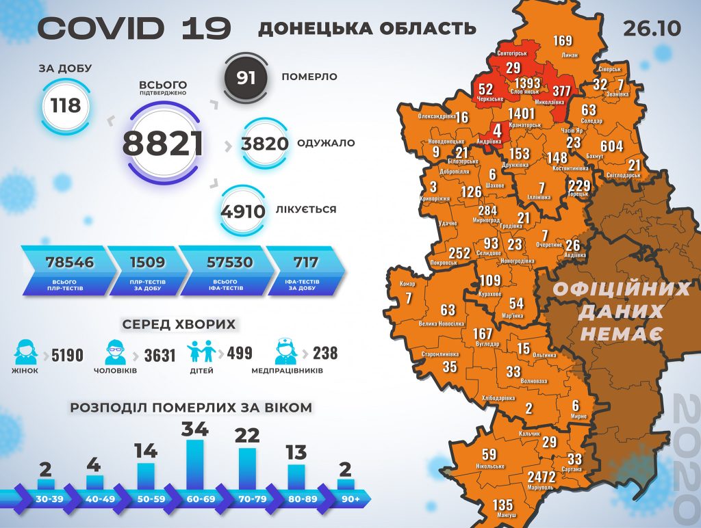 За понеділок, 26 жовтня, коронавірусну хворобу на Донеччині діагностували ще у 118 осіб, зокрема у 4 дітей: