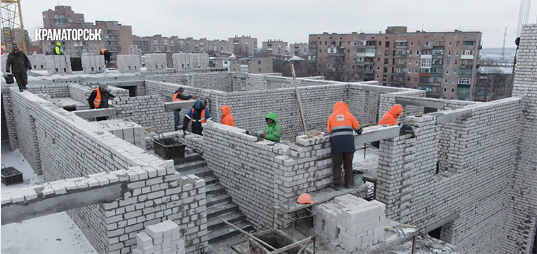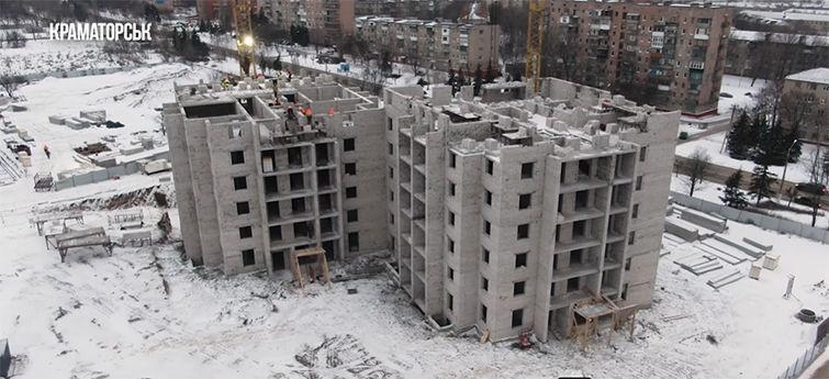 В Краматорске построят 12-этажное здание для переселенцев. Благодаря специальным добавкам к раствору строители продолжают работу даже при минусовых температурах, сейчас они уже перешли к возведению седьмого этажа.