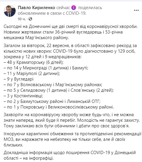 Глава Донецкой ОГА Павел Кириленко на своей странице в Фейсбук опубликовал актуальную информацию о заболеваемости COVID-19 в регионе за 22 сентября.